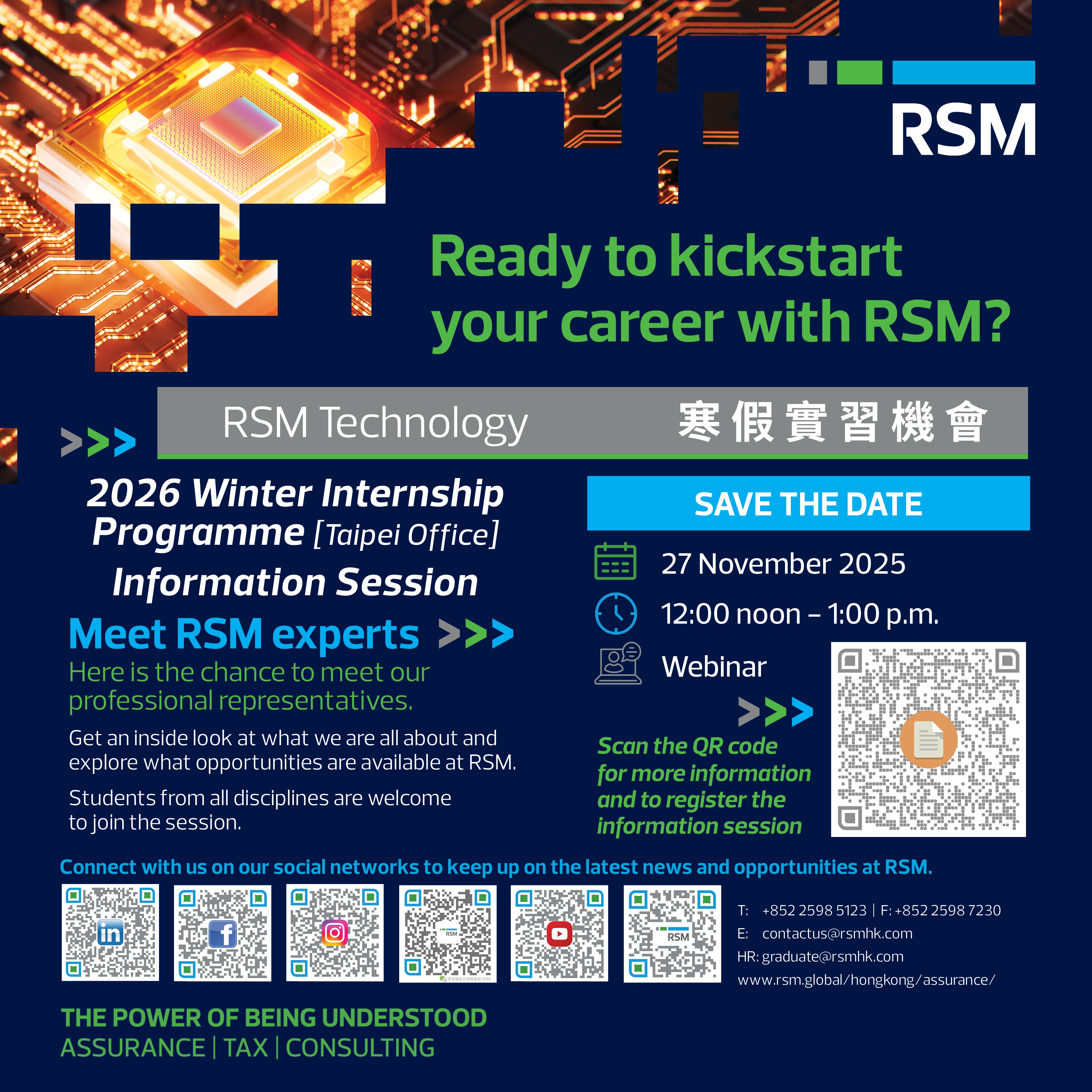 RSM 將於 2025 年 11 月 27 日(四)12:00–13:00 舉辦 2026 Winter Internship Programme – Taipei Office 線上資訊說明會,介紹寒假實習內容與申請流程。